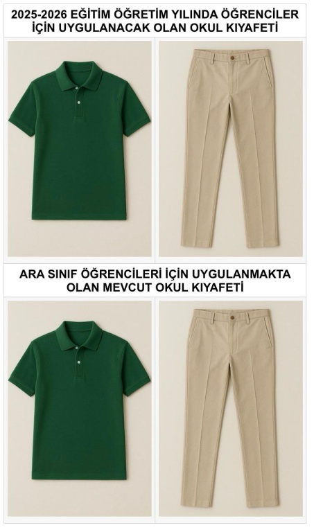 Millî Eğitim Bakanlığına Bağlı Okul Öğrencilerinin Kılık ve Kıyafetlerine Dair Yönetmelik ve Temel Eğitim Genel Müdürlüğünün 31/12/2024 tarihli yazısı ekinde bulunan “Okullarda Öğrencilerin Kıyafet / Formalarının Belirlenmesine Dair Usul ve Esaslar” da belirtilen 2025-2026 Eğitim-Öğretim yılından itibaren okul kıyafet/formalarının standartları yaş/sınıf seviyesine, okul türüne ve öğrencilerin fiziksel gelişimine uygun olacak şekilde özel işaret, baskı ve desen gibi kısıtlayıcı ayrıntılara yer verilmeden belirlenecektir hükmü uyarınca, okul öğrenci kıyafet / formaları aşağıdaki şekilde belirlenmiştir. Ara sınıflarda öğrenim gören öğrencilerimiz için önceki mevcut okul kıyafetleri kullanılmaya devam edilecek olup, yeni okul kıyafeti isteğe bağlıdır.